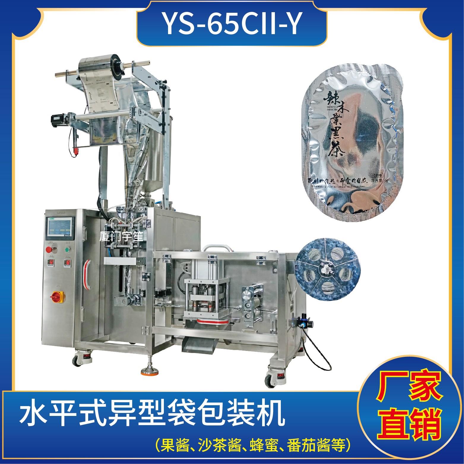 YS-65CII-Y 水平式異型袋包裝機 (使用鍍鋁、塑膠膜包裝)特點:1、適用于食品行業(yè)顆粒、粉劑、液體、醬料等物料的計量包裝。2、可自動完成制袋、計量、下料、封合、分切、計數(shù),可根據(jù)客戶要求配置打印批號等功能。3、采用觸摸屏操作PLC控制,驅(qū)動步進電機控制袋長,性能穩(wěn)定、調(diào)整方便、檢測準(zhǔn)確。智能式溫控儀,PID調(diào)…